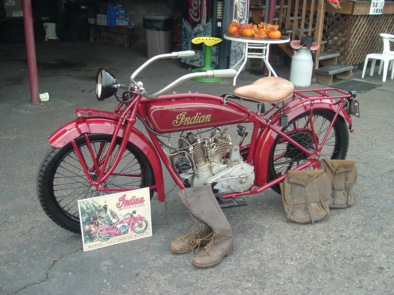 1922 Indian Scout Motorcycle. This is NOT a bike that has been pieced together using other bikes - Jim Doleman discovered this bike in and old house to be demolished in the mid-60s, he past it on to his son Jack in 1970 and has owned it every since. Restoration was done using all of it own parts other than a few bolts and nuts. Motor serial number is - 52T409. This is the original motor and had a complete rebuild in 1998 by Ted Williams in Sacramento California. All parts and supplies purchased thru Starklite cycles in California or Antique motorcycle works in Oregon City Oregon. Through the years Jack began working on the old bike and completed the frame restoration in 2010. In 2015 bike was pinstriped and had a final engine tune up by Terry Cutler in Dallas Oregon before being put up for sell. This is a nice collector bike and is ready to ride or show. Saddle bags and boots go with the bike. Call with any questions 541-942-8888 # C-232 SOLD!