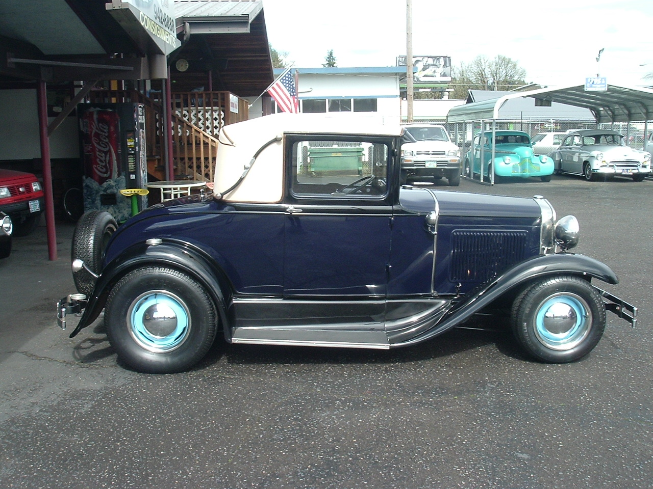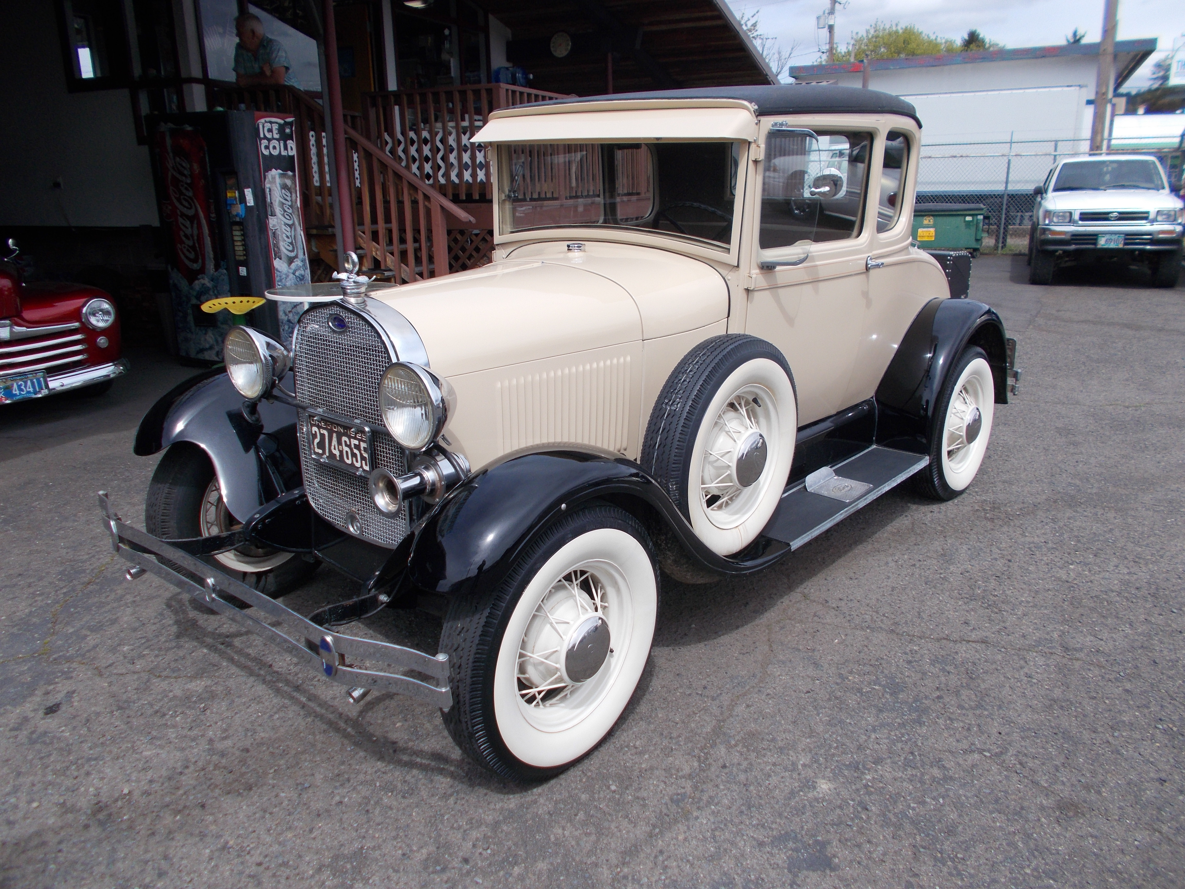 1929 Ford Model-A Rumble seat Coupe. Nice original restoration with nice upgrades. Flathead 4cyl. rebuilt with Mallory Distributor, 12 Volt system w/Alternator, Spin on oil Filter. Original 3spd. trans with Borg Warner R103 overdrive out of a 58 to 64 Rambler. Hydraulic brakes. Newer original interior, also has electric wiper and heater. Great paint and body with 1932 wire wheels. Great driver with all the upgrades! # A-2187 $18,900 NOW! $17,500 SOLD!