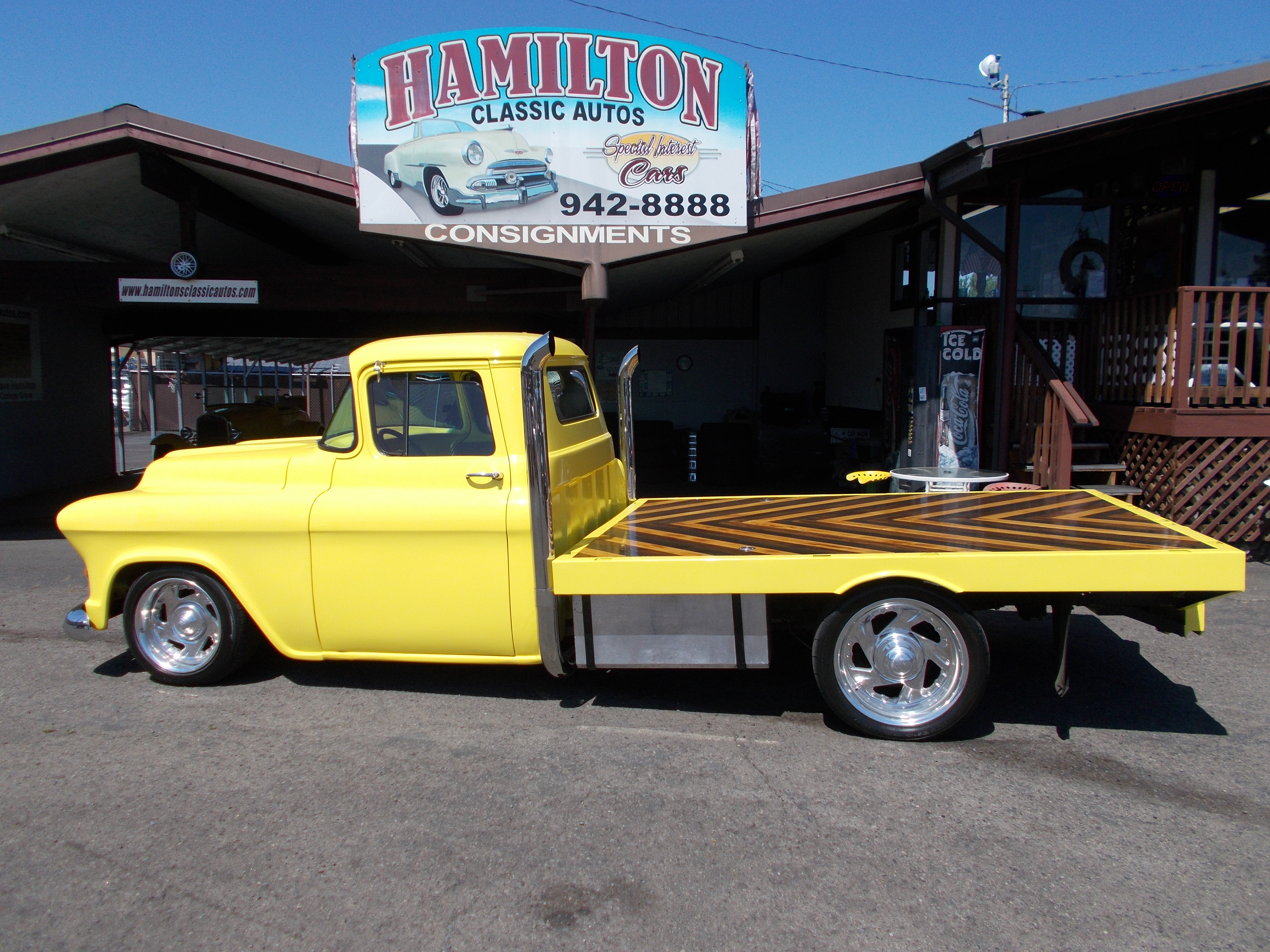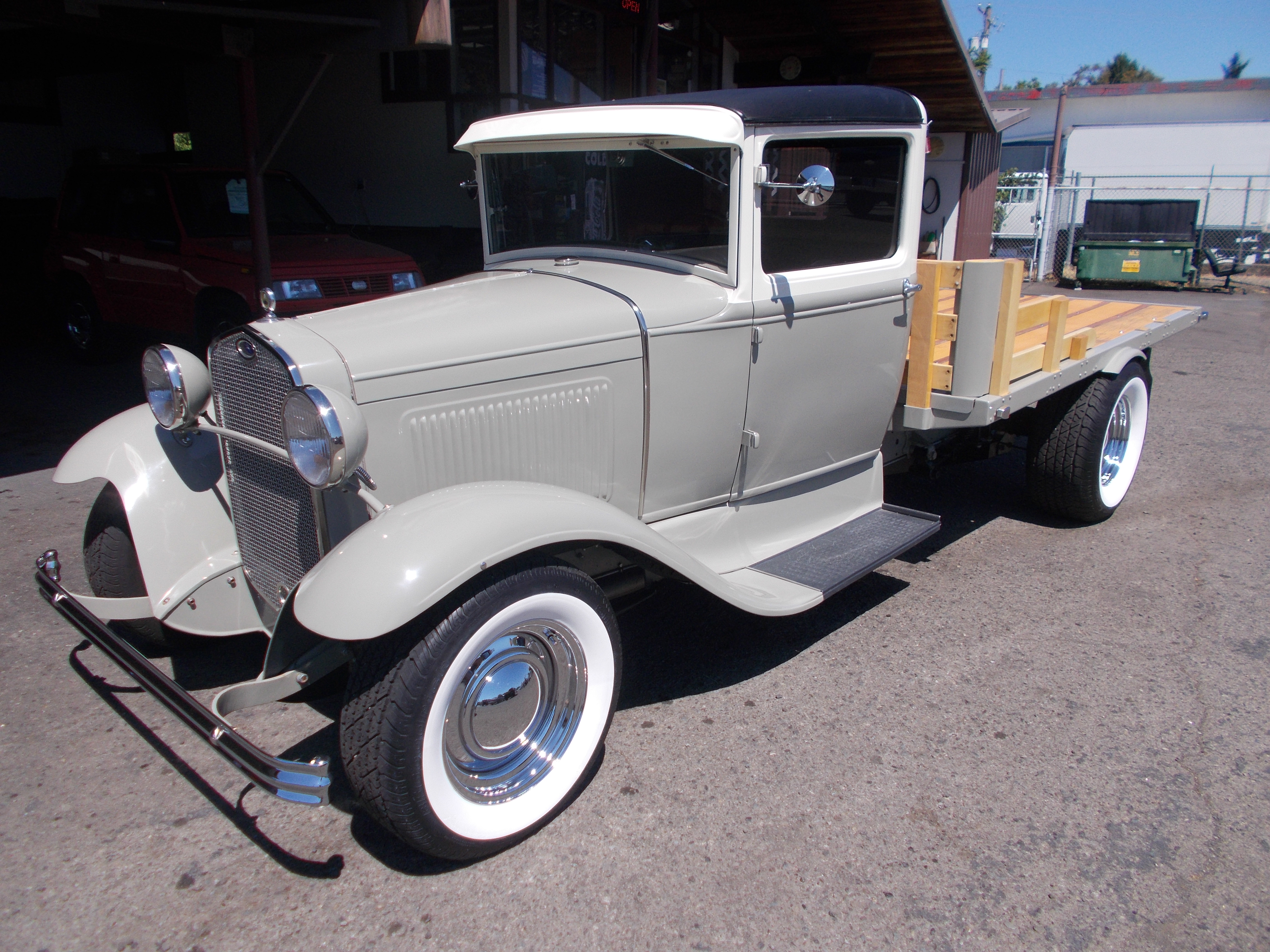 1930 Ford Model-A Flatbed Street Rod. ALL STEEL no rust. 231 C.I. V-6, Auto Transmission. Complete top quality restoration about 5 years ago. 231 Buick V-6, 9.5-1 Compression. w/390 4BBL Holley carb. Sanderson headers with Flowmaster exhaust. Aluminum radiator w/electric fan. Front axle 4" I Beam w/Disc brakes, Ford 9" rear end with 3:55 gears and drum brakes. All new wiring. Original 11 gal. fuel tank used as reserve, New 16 gal. tank under rear of bed. Flat bed started as and original 30 Model-A, Has hand picked Alder wood w/Black Walnut stripes. Interior - Quality Vinyl seats and door panels, Custom head liner, Tilt wheel, original instrument cluster and after market gauges, Tinted glass. Truck sets on Wide White Radial tire w/chrome baby moons. Truck runs and drives out excellent. Many time trophy winner. Top quality build ! # B-1825 $24,500 SOLD!