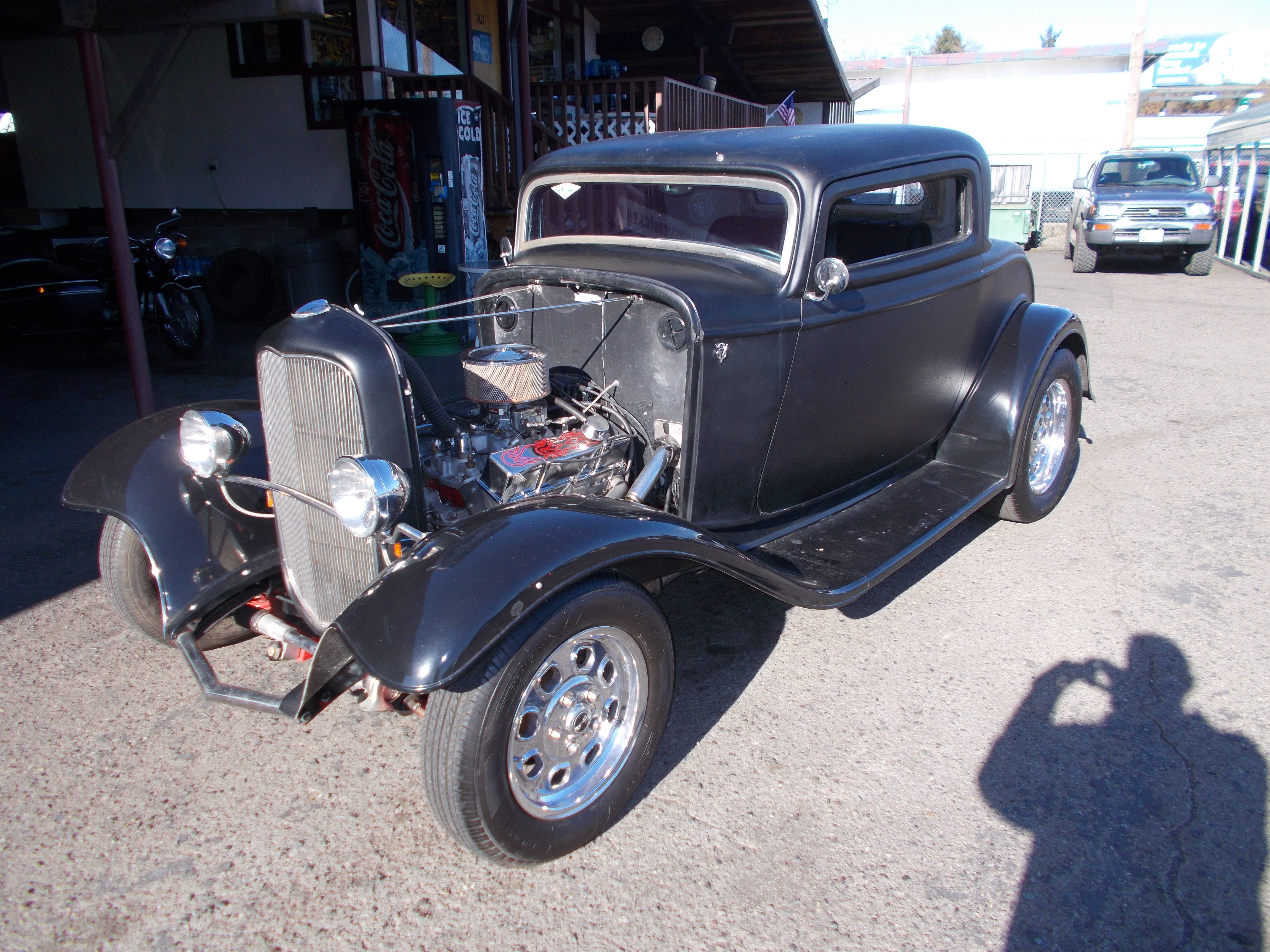 1932 Ford 3w Coupe. Fiber Glass body and fenders, steel running boards. I believe its a New TCI frame with Mustang II front and Ford 8 or 9" rear end w/coil overs. 4wheel disc brakes. 350 V-8, auto transmission. Aluminum radiator, Bucket seats, Locar shifter, PW, Gauges, Have parts for New A/C in the trunk. This is a running and driving project. # A-2203 SOLD!