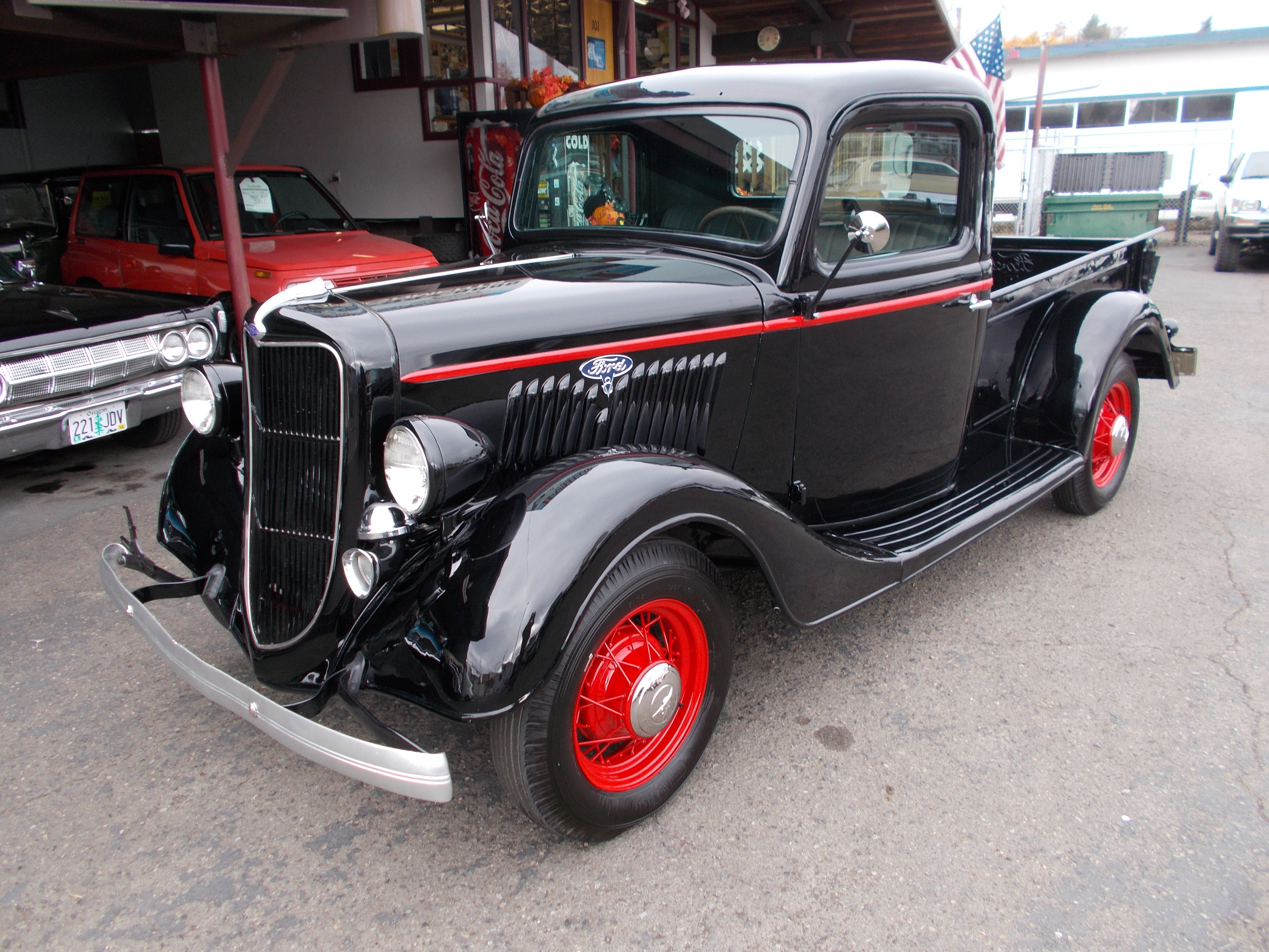 1935 Ford Pickup. Restored all stock, nice truck. Flat Head V-8 rebuilt, 3spd. transmission. The owner restored it trying to keep it as close to original as he could. This is a very complete restoration. Body don't have any rust and has new floor pans and wood. Nice paint and new interior. Have lots of receipts and pictures of restoration. Runs and drives excellent! # B-1779 SOLD!