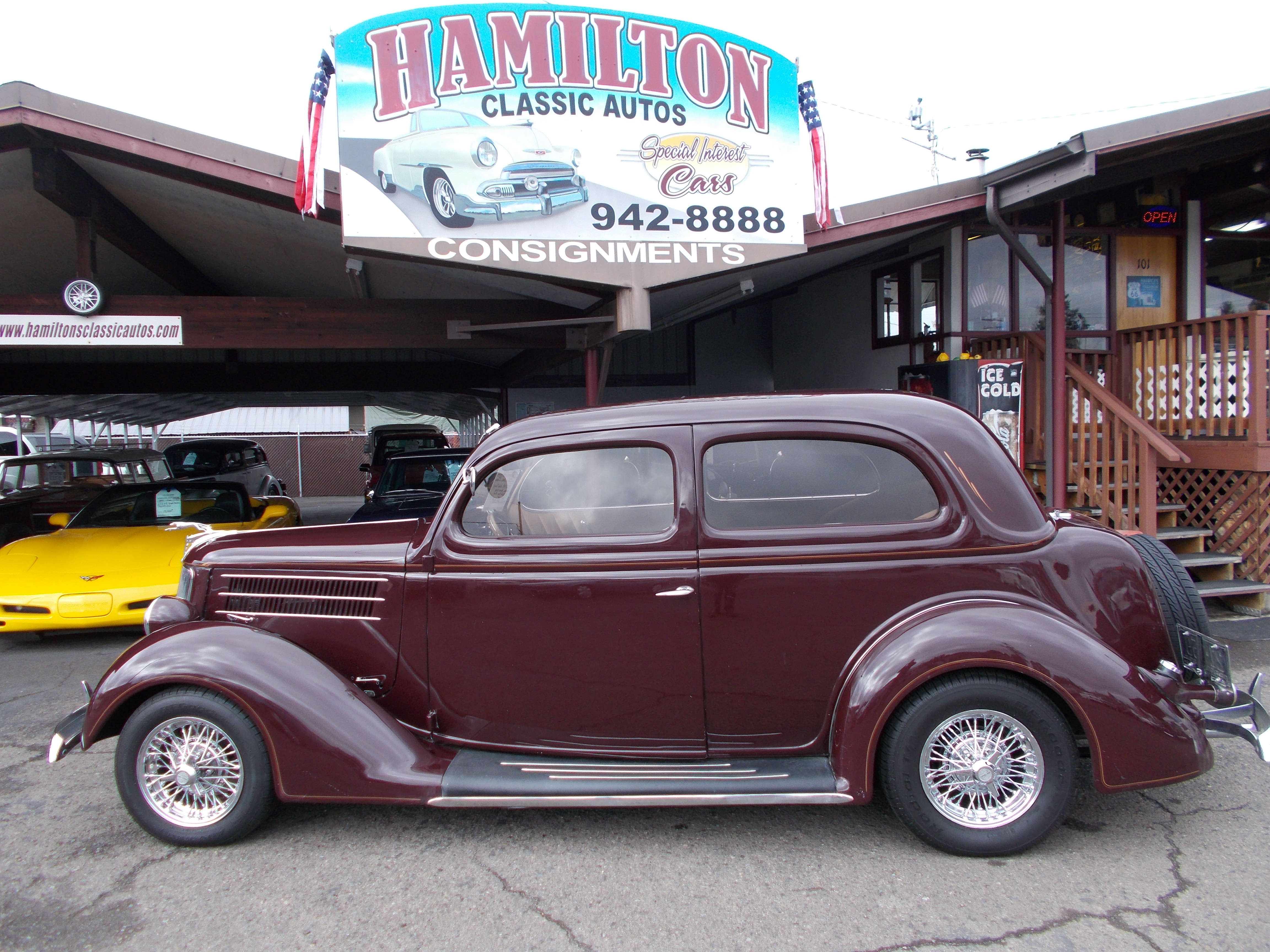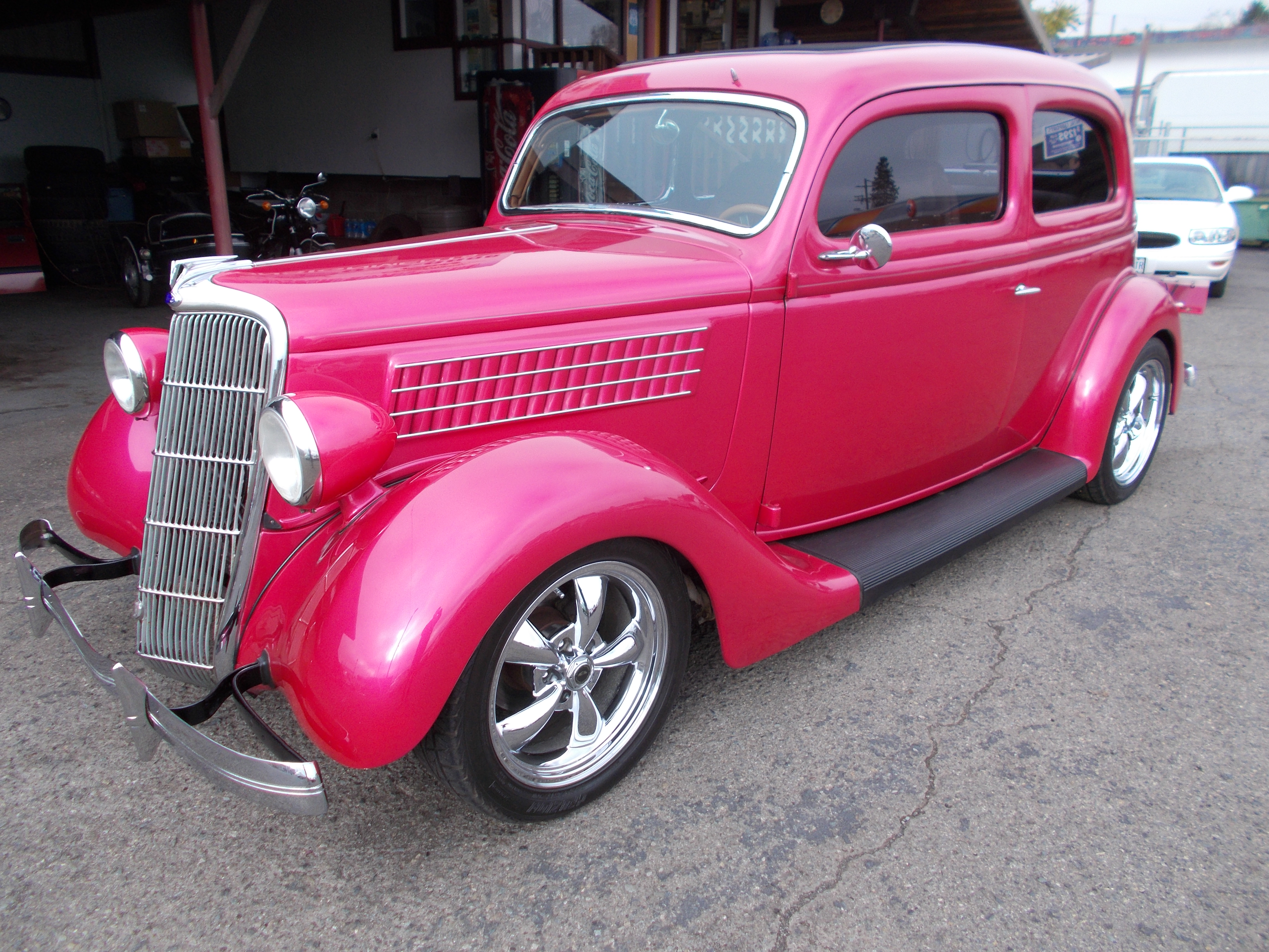 1935 Ford Slant-Back 2dr Sedan Street Rod. 327 V-8, Turbo 350 auto trans. "S" dropped front axle, ford 8" rear end. Non-power Vega steering box. Power front disc brakes, Drum rear. Car has 7,875 miles since complete restoration. Body and paint is right there at top quality. Last owner didn't like the gray tweed interior and spent $10,000 for the Leather interior in it now. Has Locar shifter, Custom steering column, Stereo with backup camera. This is a very clean and sharp looking car all the way around it. The owner said motor is a 1967 - 327 V-8, Bell housing number is 3892657 and number in front of passengers head is -V090IYS. # A-2201 $34,500 NOW! $29,900