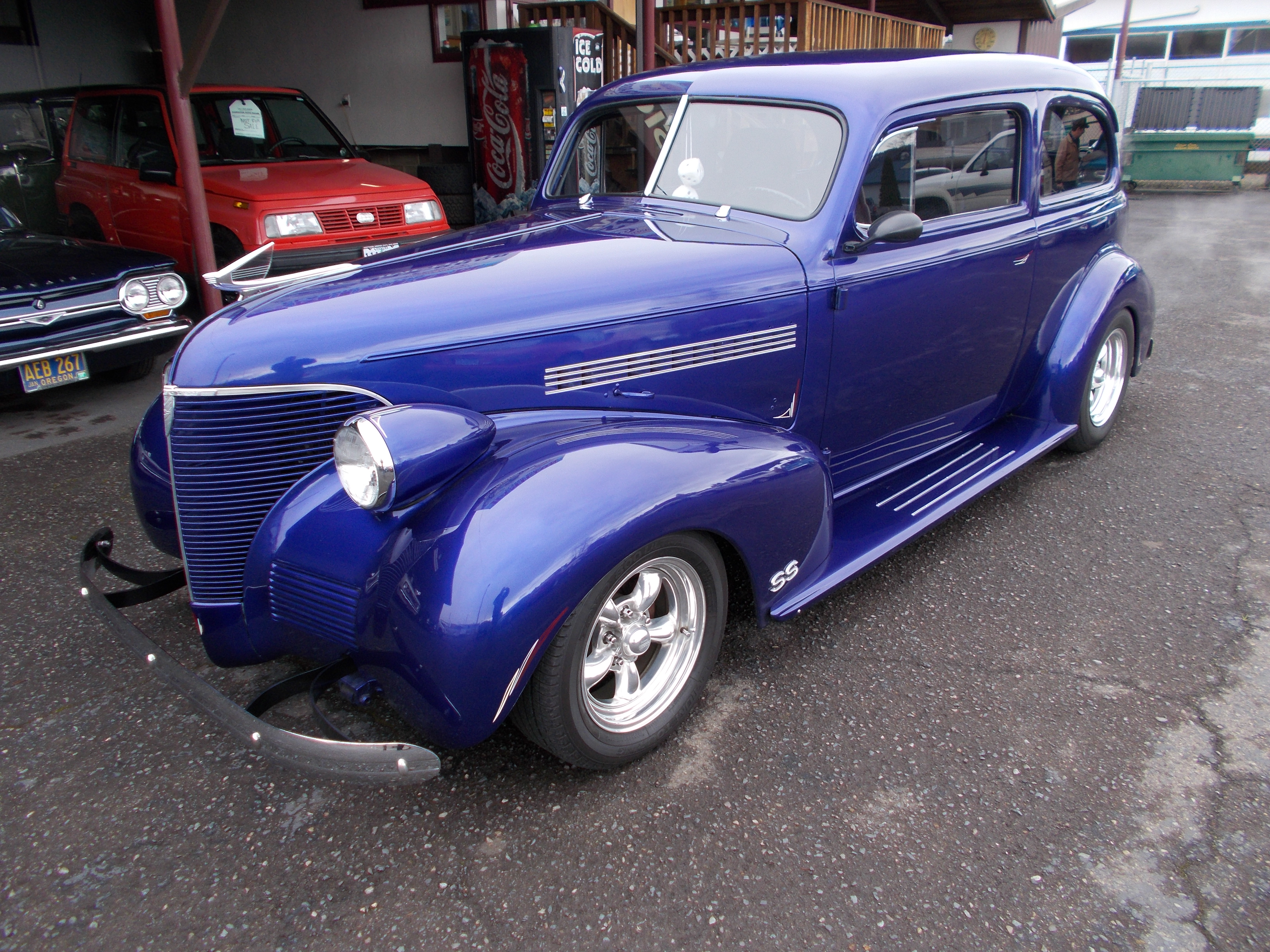 1939 Chevy 2dr. Sedan Street Rod. 350 V-8, Turbo 400 automatic. Drop straight front axle with Vega steering box and power front disc brakes, Rear end is 1980 Fire Bird w/drum brakes. Motor was completely gone through in 2015 (Low miles) and has light cam, Edlebrock carb. HEI ignition and block Hugger headers w/Flow Master exhaust. Body and paint is in great condition, car was taken apart to paint with many coats and some pearl. Fenders are steel with no bondo, Running boards from Summit Racing. Interior is custom from Jerry's Upholstery in Lebanon, Front seats are 98 Explorer and drivers side is power. CD player, Aftermarket gauges. New glass from Bob's glass in Junction city. American Racing wheels with like new tires. This car is ready for cruising and show shines. # A-2045 $19,500 SOLD!