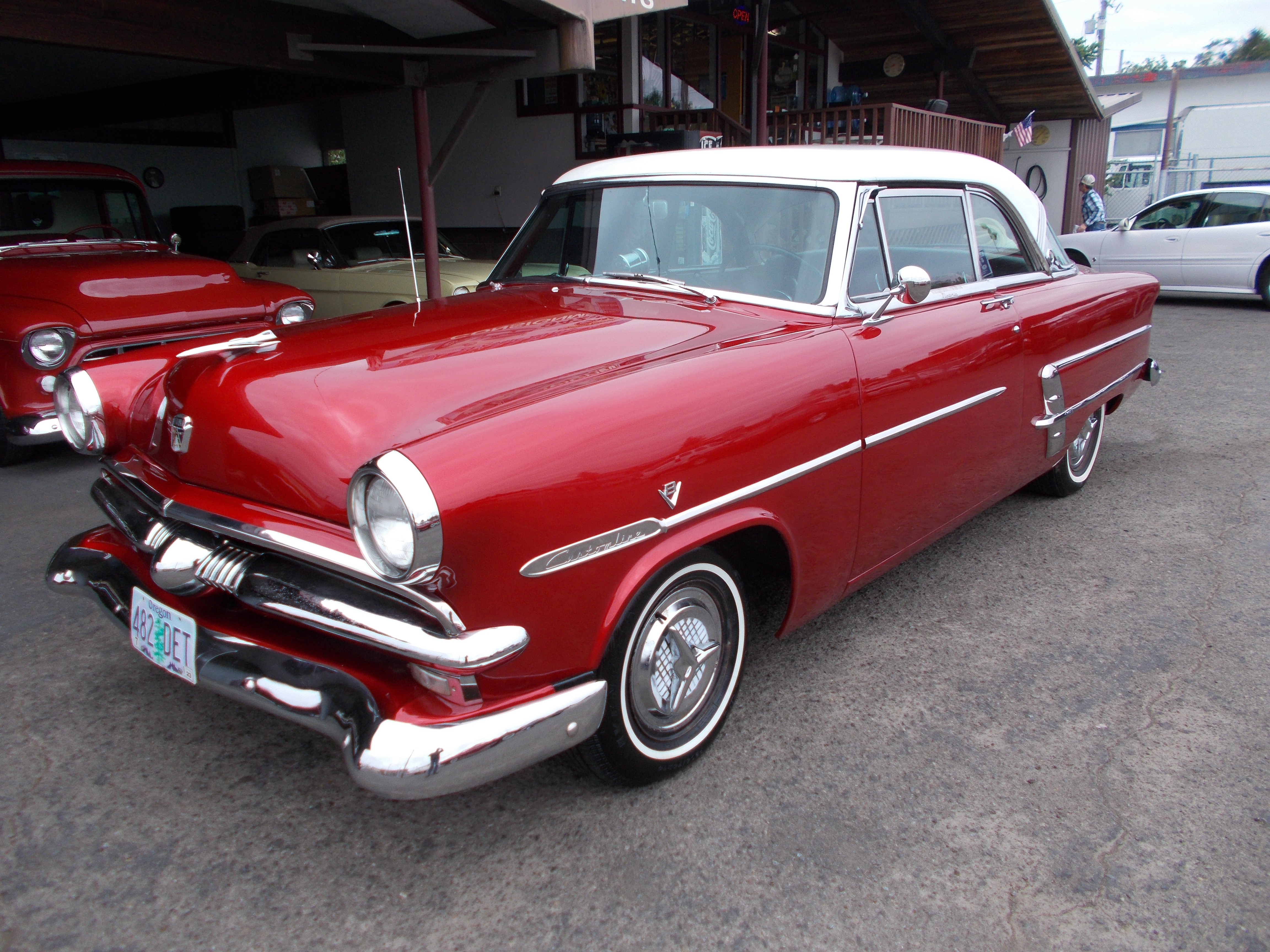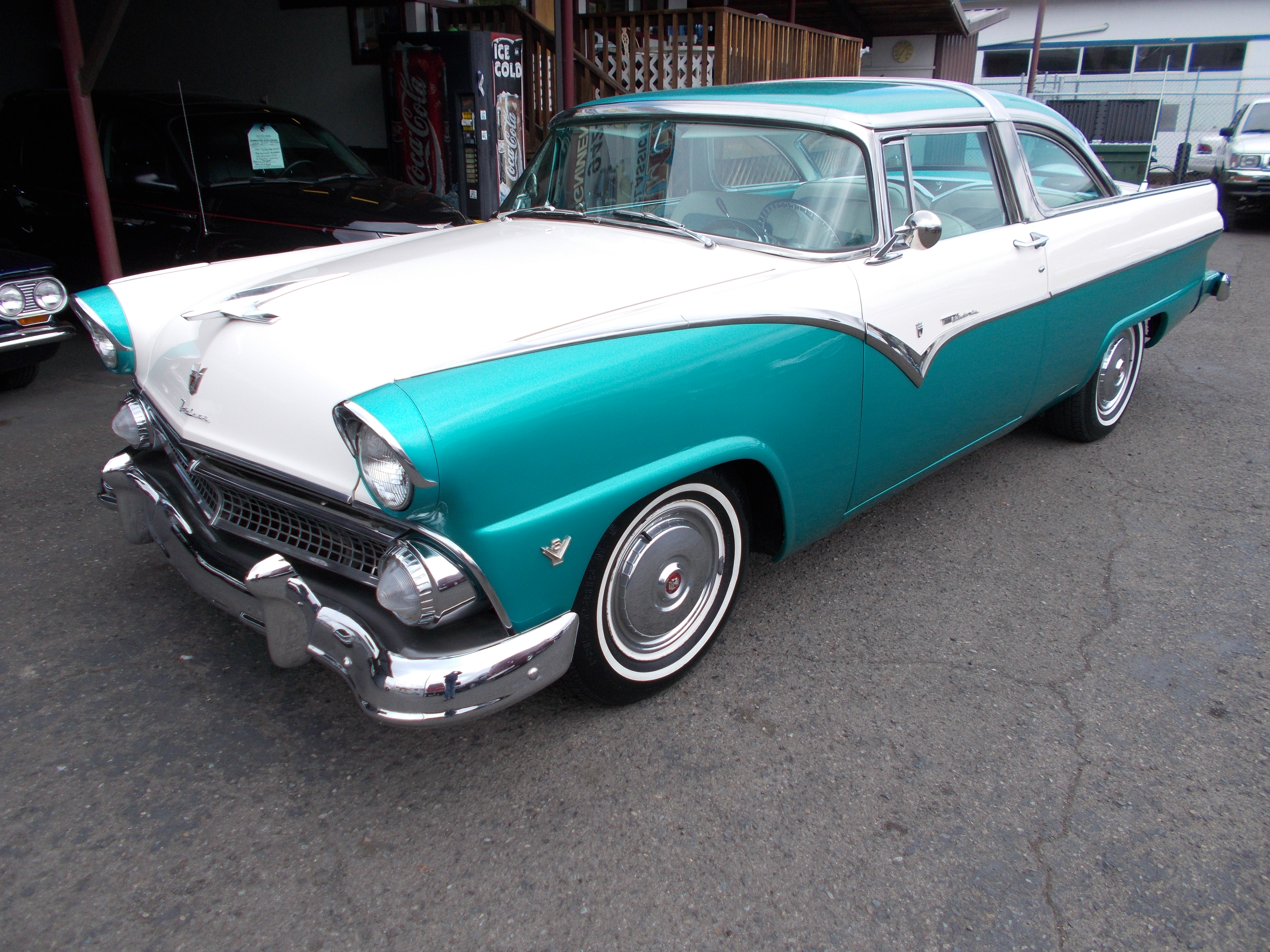 1955 Ford Crown Victoria. Nice Car with Stock appearance. 302 V-8, C-4 auto transmission w/ Gear Vendors under-overdrive added. Lowered stock front suspension with Power rack steering. 9" Currie rear end. Power 4-wheel Disc brakes. A/C and heat. Continental kit. Fender Skirts. Body and paint in great condition, This is not a perfect car but a nice show and shine, Driver. Newer interior in excellent condition. Motor and trunk compartments nicely detail. Undercarriage looks good. All chrome, stainless and glass very good. New aluminum radiator, Have a folder with receipts and info on work done. Car is ready to cruise ! # A-2054 $29,500 NOW! $24,500 SOLD!
