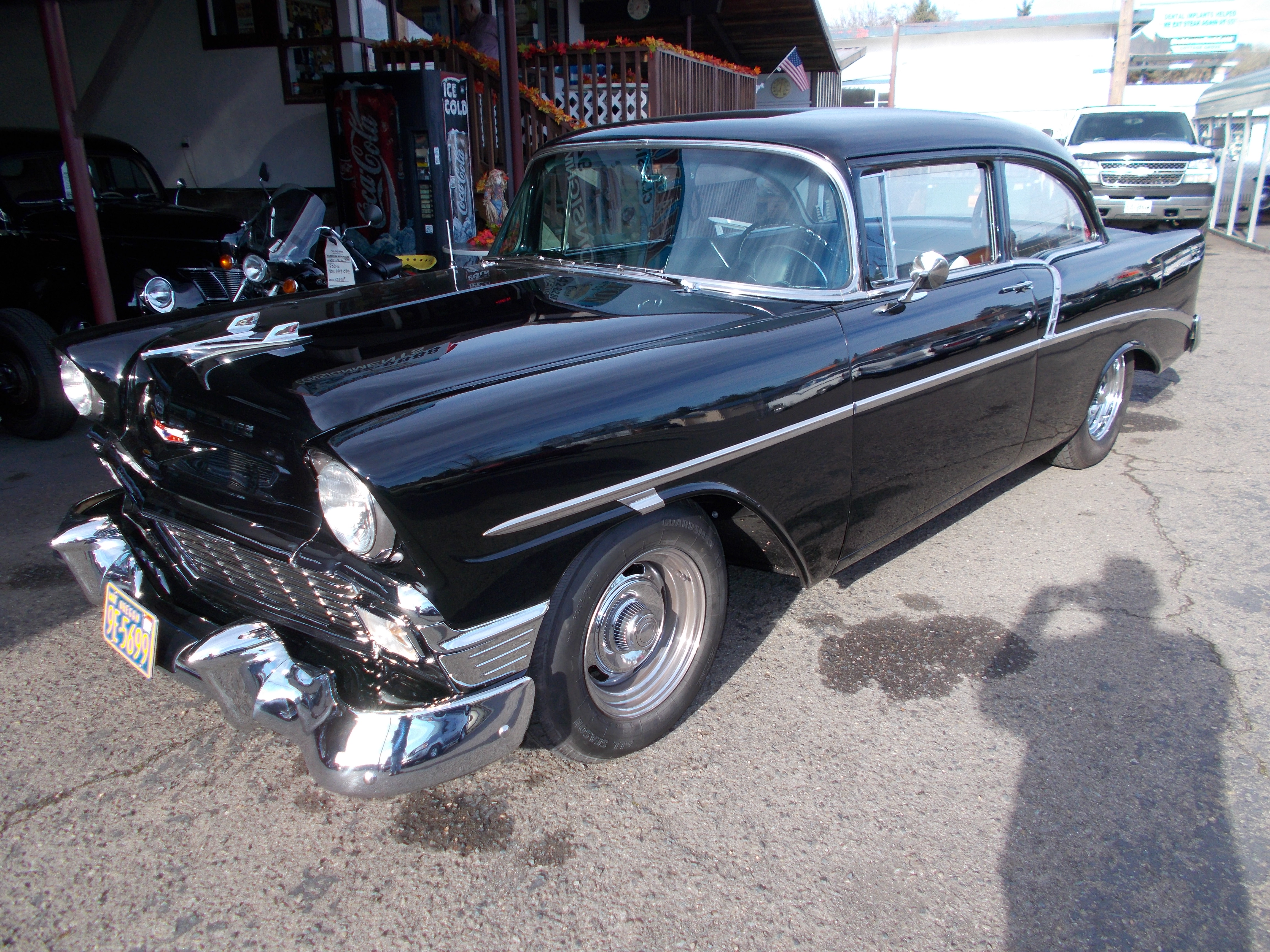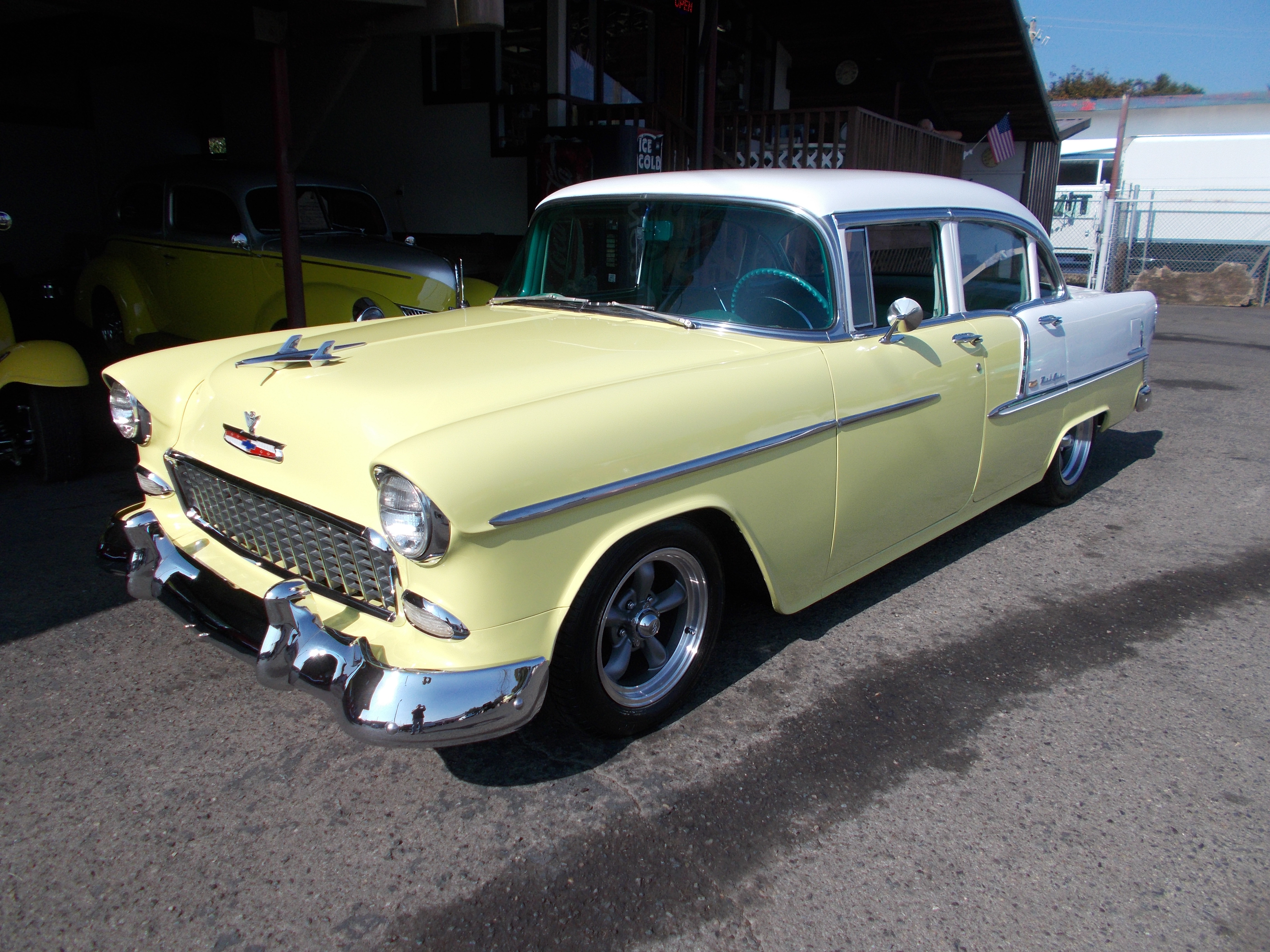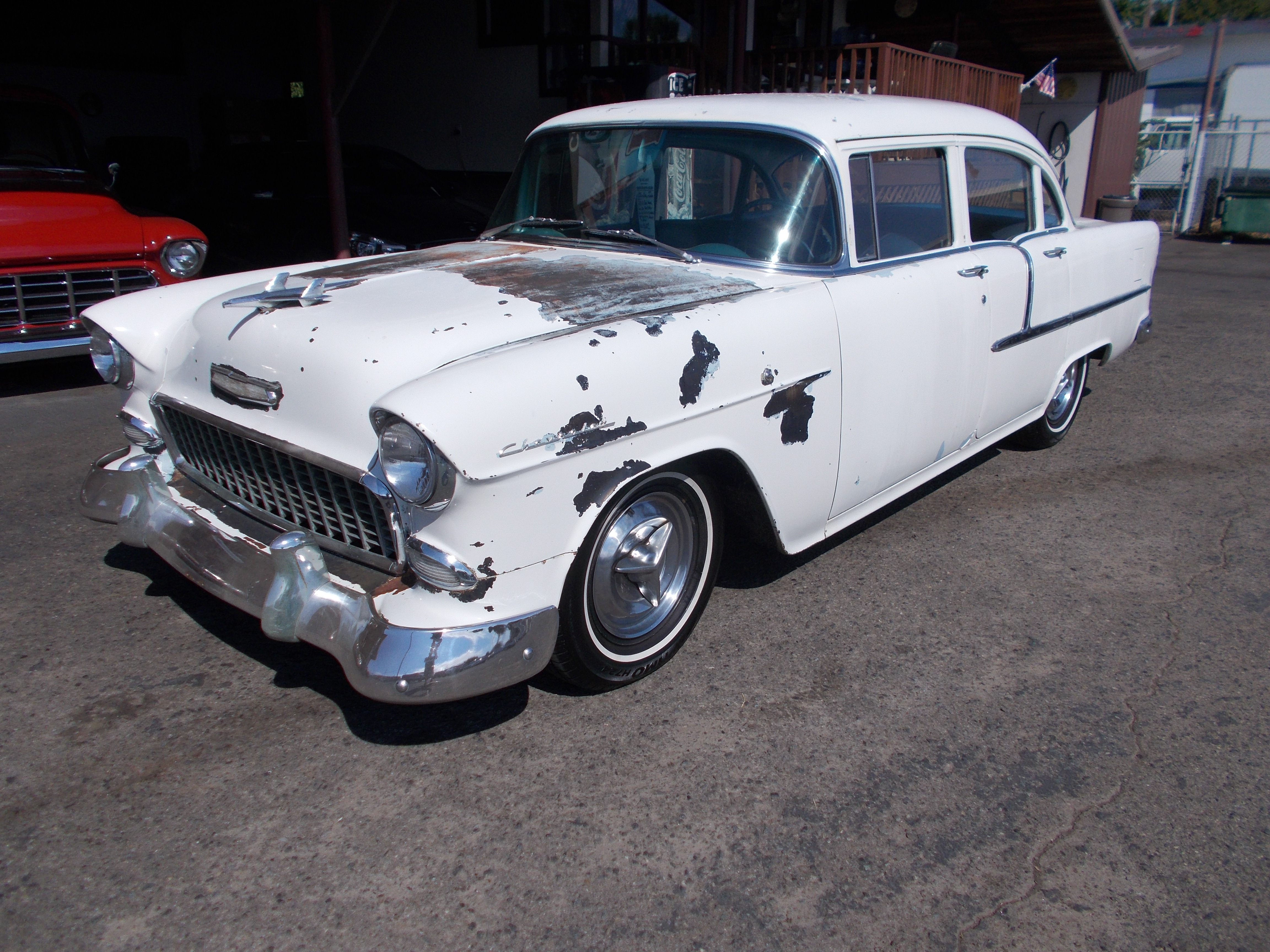 1955 Chevy 4dr. Sedan. 283 V-8, 5spd. manual trans. Dropped spindles w/Power front disc brakes, 1" inch lowering blocks in the rear. New exhaust, New fuel tank, sender and fuel lines, new windshield, New carpet and striker plates, new tires, new clutch assembly and new battery. Runs out excellent. interior is pretty good with dash and door panels still original. Body is above average solid. Has had some patch panels in front floor pans and has a few rust bubbles down low on rear doors. Great driver as it sets. # A-2194 $14,500 NOW! $12,900 SOLD!