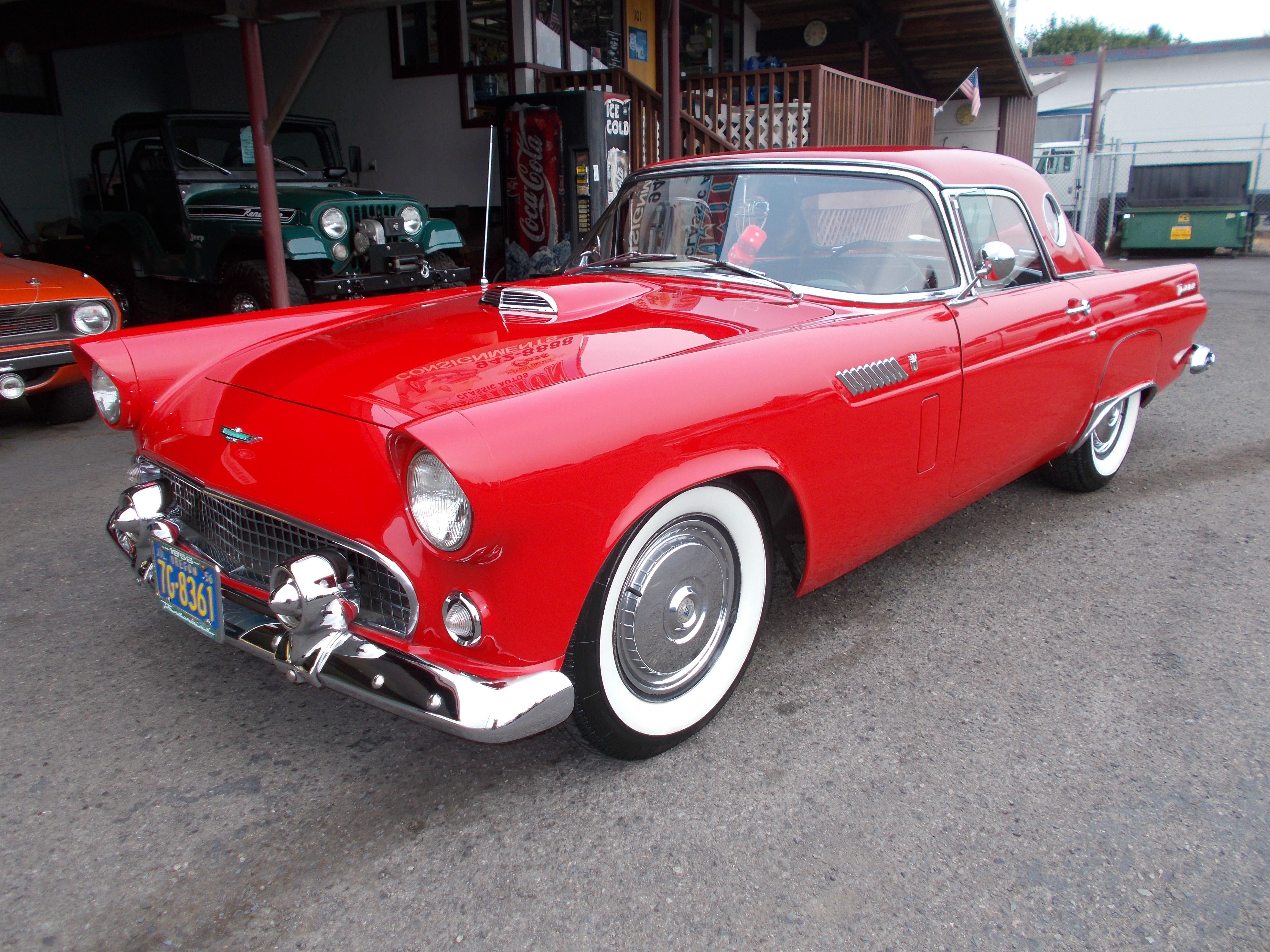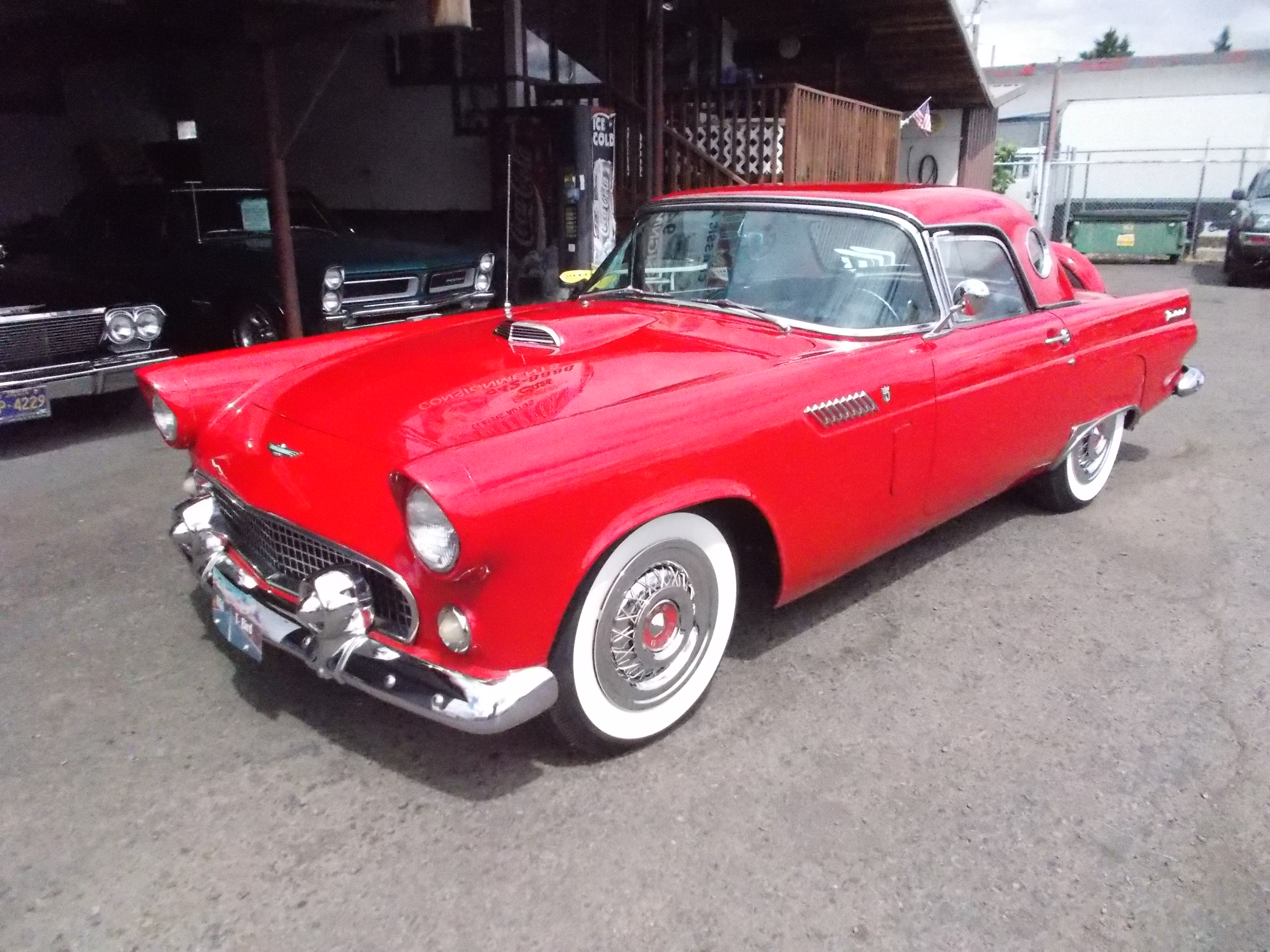 1956 Ford Thunderbird. 312 V-8, Auto trans. Both Tops. Very nice T-Bird, It sold new right here at Ford dealership in Cottage Grove. Car was restored around 1990. We sold the car here in 1991 and has had the same owner since. Car has a great body and the paint still looks fresh. interior redone original other then the seat is done in cloth. Car also has white soft top. The 312 motor and transmission have been rebuild by this owner and has less then 5,000 miles on them. WWW radial tires. Real nice old T-Bird. # A-2180 $34,500 SOLD!