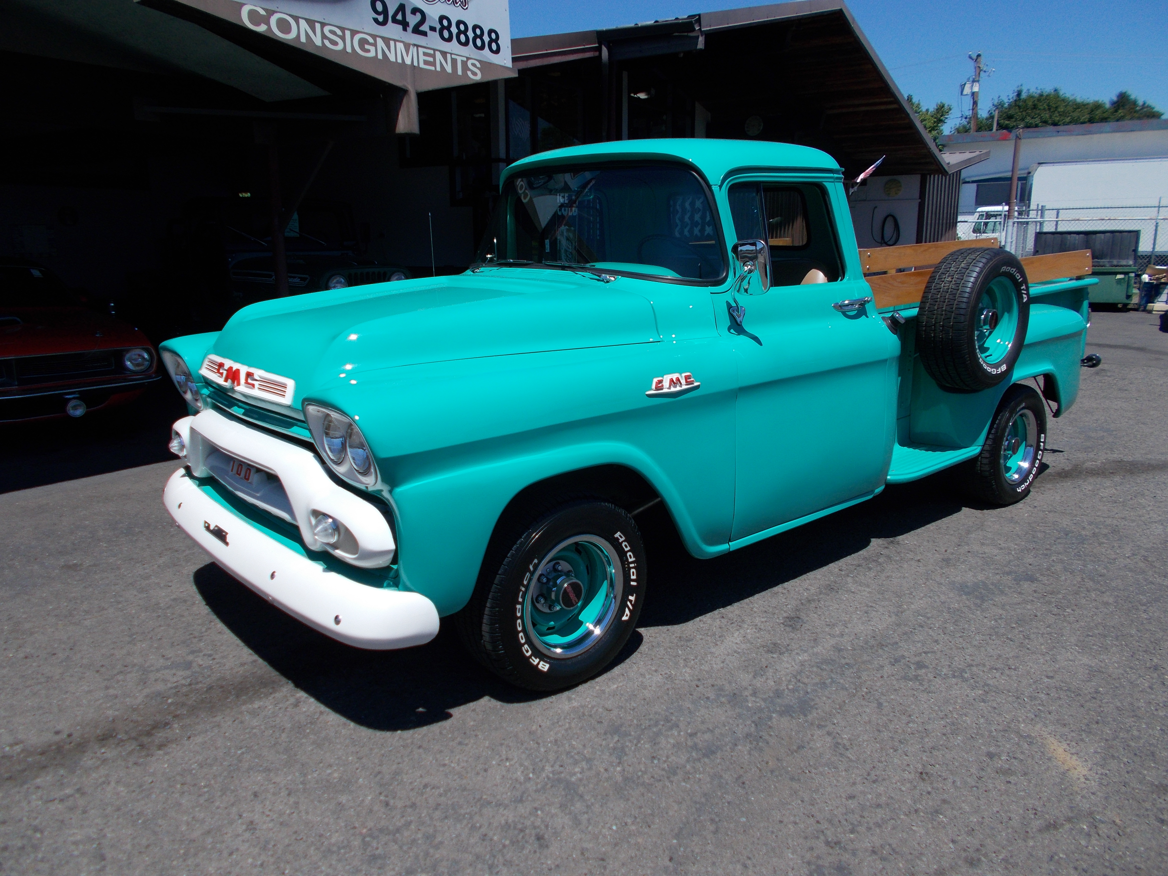 1959 GMC 100 Pickup. Ground up restoration. 270 inline 6cyl. 3spd. column shift. Motor rebuilt stock with Clifford intake and Weber carb, Split header with dual exhaust. Body is super solid and straight with no rust problems. New wood bed. Interior all new, Original dash cluster with Factory tach. CD player. New fuel tank and lines. Undercarriage looks as good as the rest of truck. Too much to list, it looks pretty much like most every bolt and nut on truck is new. # B-1846 $22,500 SOLD!