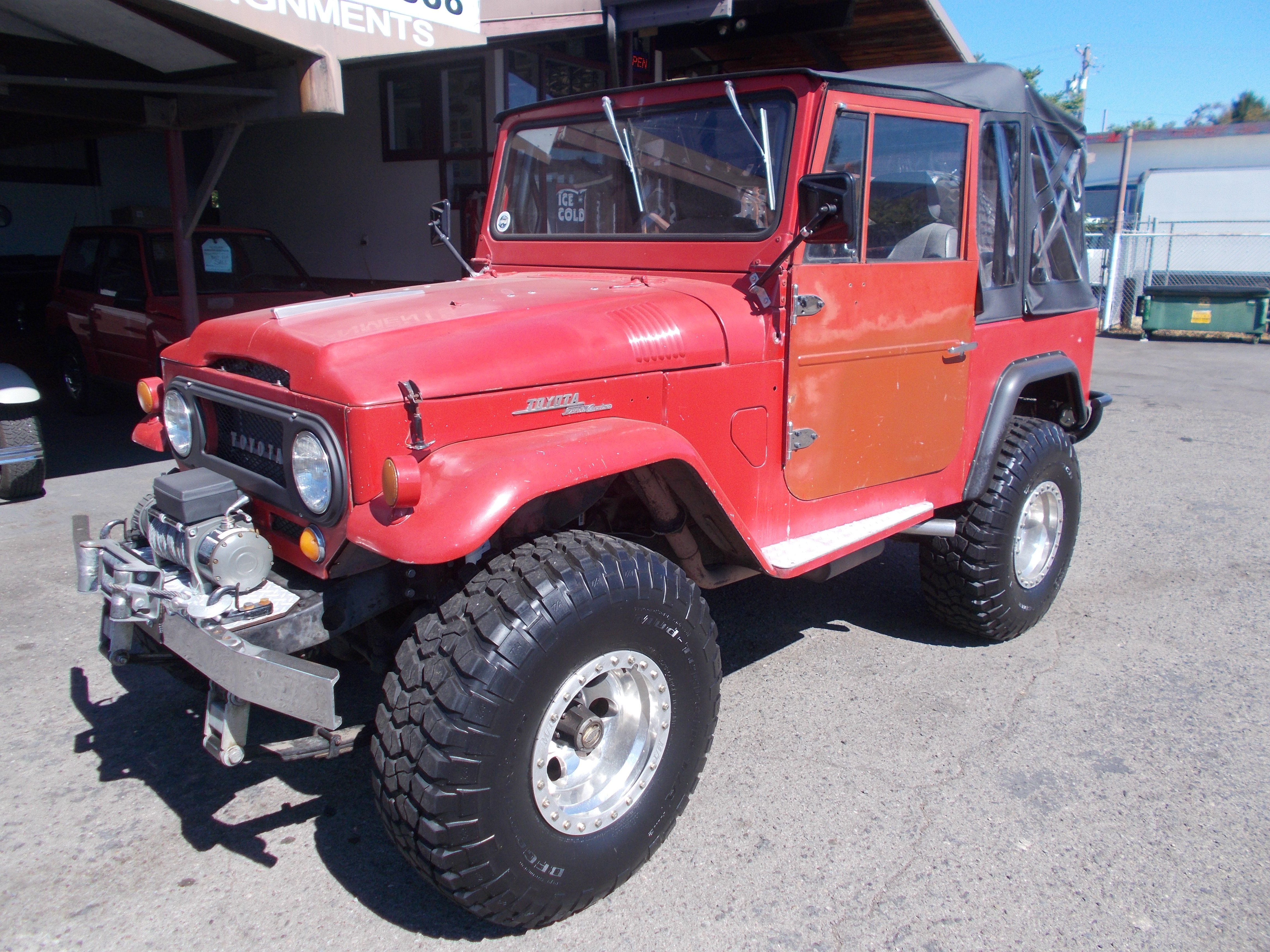 1968 Toyota Land Cruiser FJ40. Both Hard and Soft Top. 350 V-8, Turbo 350 Auto Trans. This is a great running and driving solid FJ but still kind of a project to finish how you like. Winch, heater, wiper, lights everything works but speedometer not hooked up and blinkers don't always work. Body is pretty straight and solid there is some rust down low on rear under tail gate - Shown in pictures. Tube rear bumper and extra doors, Newer soft top, Hard top is correct for year but purchased separate so is not same color but is good and solid. 4" lift with like new 35" tires and matching spare, new shocks and front end alignment. Motor is not suppose to have more then 10,000 miles but have no records for that. It was taken to mechanic before we got it and had $700 spent on tune up, Carb rebuilt and just going thru checking all mechanicals, so it runs and drives great. Have a folder of receipt but not for everything that has been done. # B-1826 $25,900 NOW! $19,500